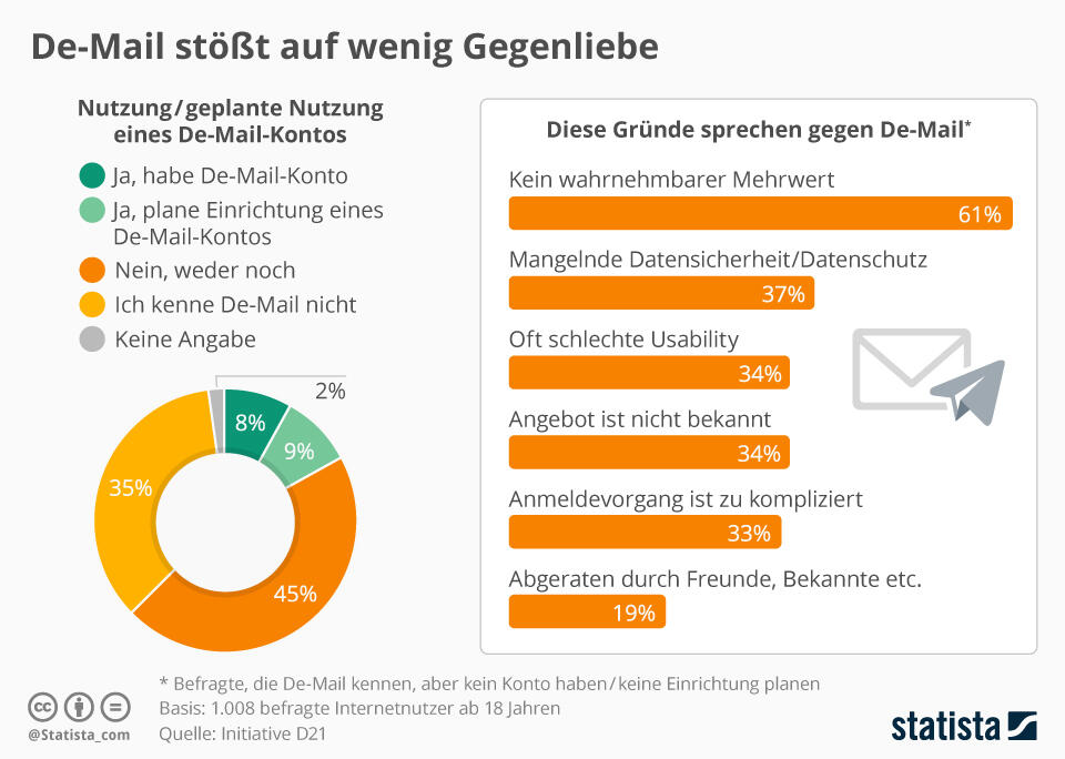 In einer Umfrage von Initiative D21 heißt es, dass 80 Prozent der Online-Nutzer weder De-Mail nutzen, noch nutzen wollen. Immerhin 9 Prozent planen ein Konto einzurichten und nur 8 Prozent nutzen diese Option bereits. Einer der am meisten genannten Gründe gegen die De-Mail: Es fehlt ein wahrnehmbarer Mehrwert.