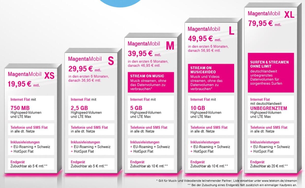 So erhalten Kunden im MagentaMobil XS für 19,95 Euro pro Monat bescheidene 750 MB Datenvolumen, im MagentaMobil S für 36,95 Euro monatlich 2,5 GB und im MagentaMobil M gibt es für 46,95 Euro pro Monat 5 GB Datenvolumen. Ab dem Tarif MagentaMobil M kann zudem StreamOn Music hinzugebucht werden.