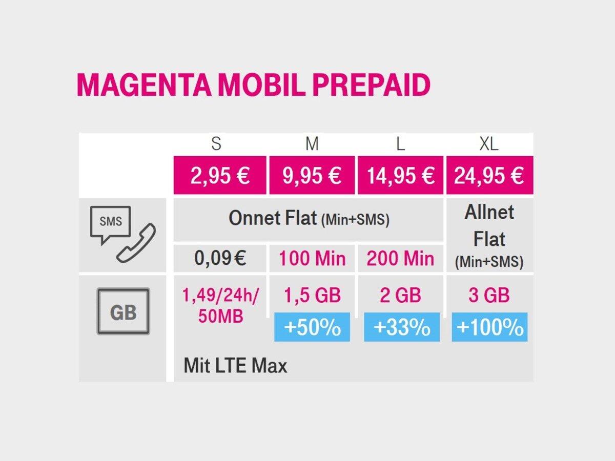 Die Tarif-Ausführungen S, M, L und XL bestehen fort, genauso wie die Laufzeit von jeweils vier Wochen. Die Telekom erhöht allerdings in allen Tarifen das verfügbare Datenvolumen (mit LTE max.).