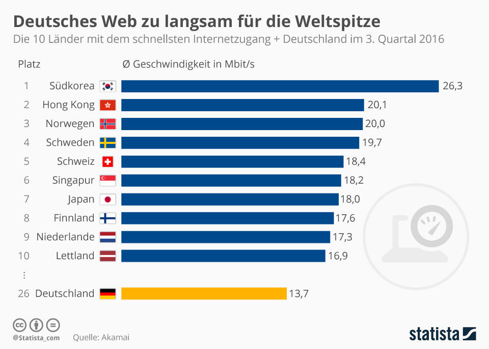 Auch im Dezember können wir mal einen Blick darauf werfen, wo sich Deutschland beim Thema Internetzugänge einordnet. Die unten eingebundene Grafik zeigt die 10 Länder mit dem schnellsten Internetzugang, sowie Deutschland im 3. Quartal 2016. Es fällt schnell auf, die Bundesrepublik liegt im Ranking der Länder mit dem schnellsten Internetzugang derzeit nur auf Platz 26. Hierzulande kommt man im Durchschnitt mit 13,7 Mbit/s ins Netz. Damit hat sich Deutschland gegenüber dem Vorjahr im Akamai-Ranking um vier Plätze verschlechtert.