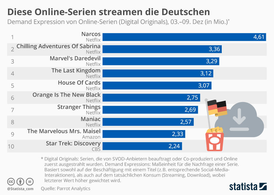 Bei Parrot Analytics hat man sich daher die „Demand Expressions“ ausgedacht, bei denen man Aktivitäten in sozialen Netzwerken und mehr beobachtet. Mit diesem Parameter wird dann geschaut, welche Online-Serien am beliebtesten in Deutschland sind. Bei Statista hat man dann eine Grafik erstellt.