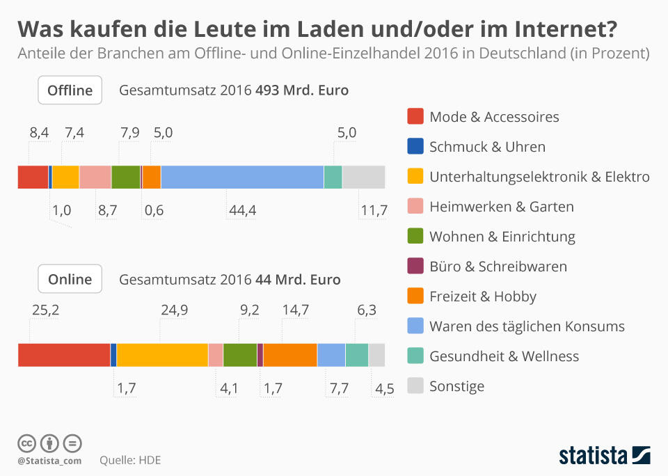 Die Grafik von Statista zeigt die Anteile der Branchen am Offline- und Online-Einzelhandel 2016 in Deutschland (in Prozent)