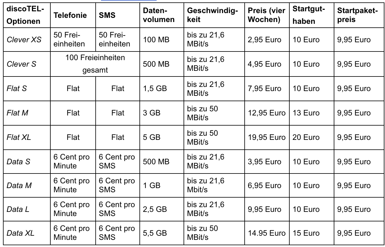 Die Flat-Optionen ohne Limit für Telefonate und SMS in alle deutschen Netze sowie Internetvolumen mit LTE-Geschwindigkeit stehen ab 7,95 Euro pro vier Wochen bereit. Für die ausschließliche mobile Internetnutzung bietet discoTEL Tarif-Optionen ab 3,95 Euro an. Unterwegs sind Kunden wie üblich im Netz von Telefónica Deutschland.