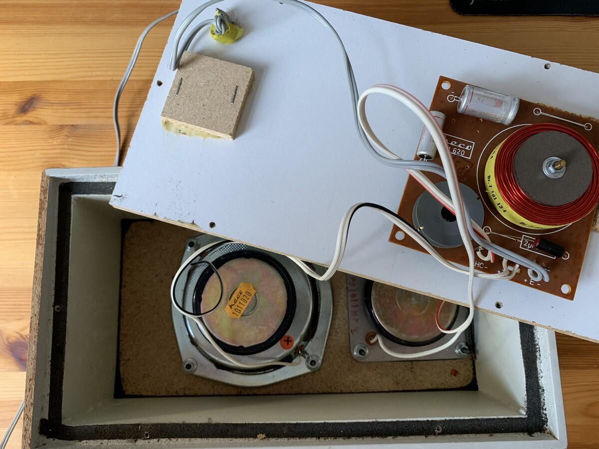 Diese sind unrettbar und waren auch schon 1974 nicht die beste Qualität. Also fliegen sie komplett raus und werden durch neue ersetzt. Zum Glück hat die Hochtöner dieses Schicksal nicht ereilt und auch die Frequenzweiche funktioniert noch. Diese Komponenten kann ich also behalten.