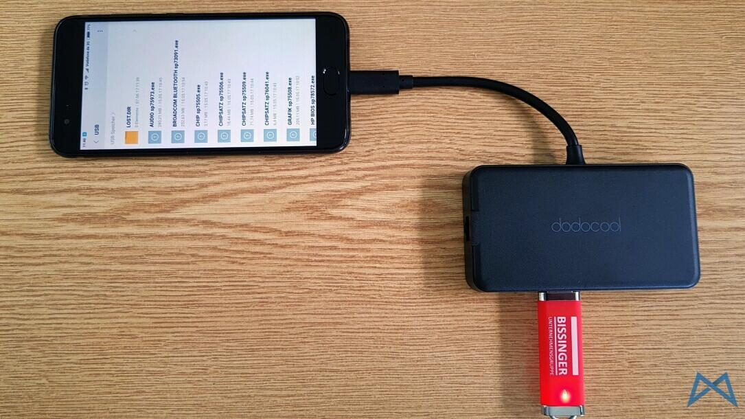 Natürlich kann der Hub auch an Smartphones mit Typ-C-Anschluss genutzt werden. Hier wird aber nicht garantiert, dass jeder Anschluss vom Endgerät unterstützt wird. Probeweise habe ich den Hub an das aktuell im Test befindliche Xiaomi Mi6 mit USB Typ-C angeschlossen. Ein alter USB-Stick wurde anstandslos erkannt: