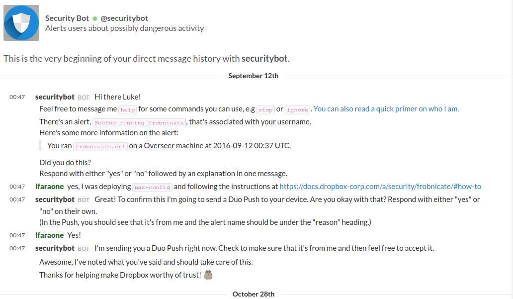 Securitybot verbindet das Erfassen neuer Warnungen mit der Mitarbeiterkommunikation und garantiert eine optimierte und unverzügliche Interaktion mit dem Mitarbeiter. Bei jedem Alarm wird dieser schnell benachrichtigt und gefragt, ob er für das Auslösen des Alarms verantwortlich ist. Anschließend wird er um eine kurze Erklärung gebeten. Die Antworten werden gesammelt und über das Überwachungssystem an die Dropbox-Techniker weitergeleitet, sodass ihnen alle Daten für eine regelmäßige Überprüfung sofort zur Verfügung stehen. Alle Rückmeldungen werden via 2FA gespeichert, also selbst wenn das Nachrichtensystem beeinträchtigt wäre, würde Securitybot einen Angriff erkennen.