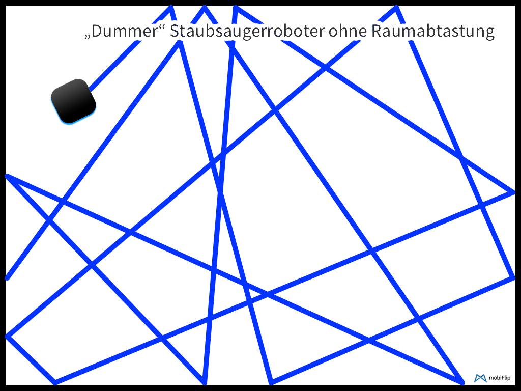 Das machen sie so lange, bis (theoretisch) jede Ecke mal abgefahren wurde. Je nach Raum und den Gegenständen darin kann das etwas dauern, da sie Hindernisse nicht gekonnt umfahren, sondern an diesen einfach einen neuen Zufallsweg suchen. Nachfolgende Grafiken verdeutlichen das symbolisch.