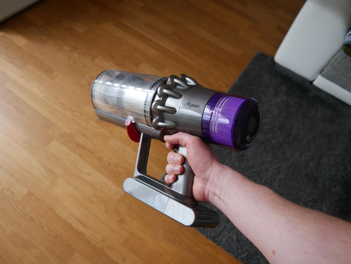Das einzige Problem, welches ich im Test hatte: Man muss die Saug-Taste beim V11 durchgehend gedrückt halten. Hier wäre eine Arretierung nett gewesen, da vor allem der durchgehende Druck mit dem Zeigefinger etwas lästig sein kann.