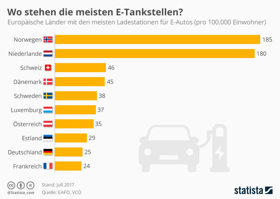 Laut Daten des Verkehrsclubs Österreich (VCÖ) steht Deutschland mit etwa 25 Stationen pro 100.000 Einwohner (etwa 20.300 absolut) weiter unten im Ranking. Insgesamt gibt es in der Europäischen Union mit Stand Juli 2017 mehr als 104.000 öffentliche Ladestationen.