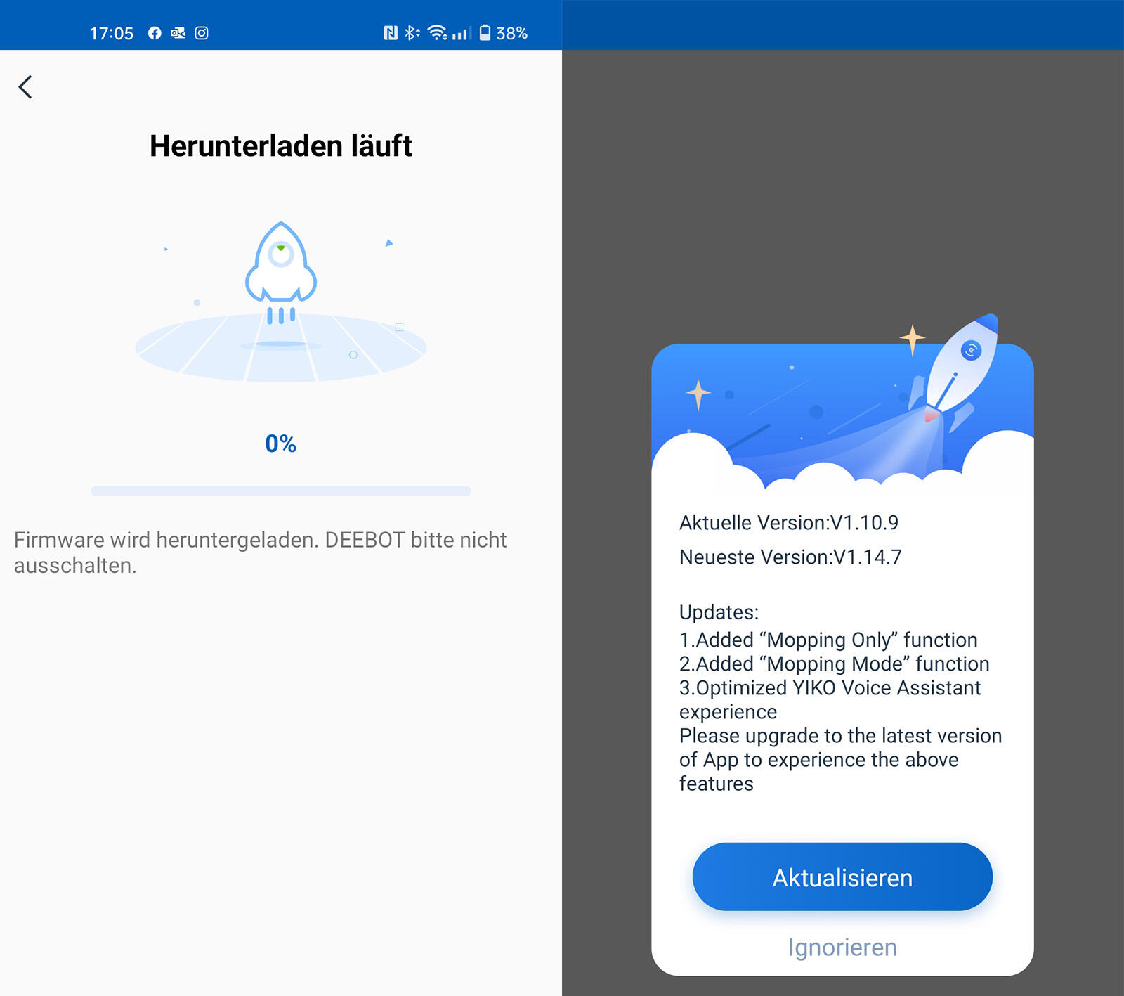 Idealerweise sollte nun die Deebot App heruntergeladen werden, damit der Sauger auch perfekt eingerichtet werden kann. Nach dem üblichen Registrieren und einloggen nebst verbinden mit dem WLAN ist der Sauger auch schon sehr schnell eingerichtet und betriebsbereit. Es folgt die obligatorische Suche nach einer aktuellen Firmware und das Update, welches dann evtl. nötig ist.