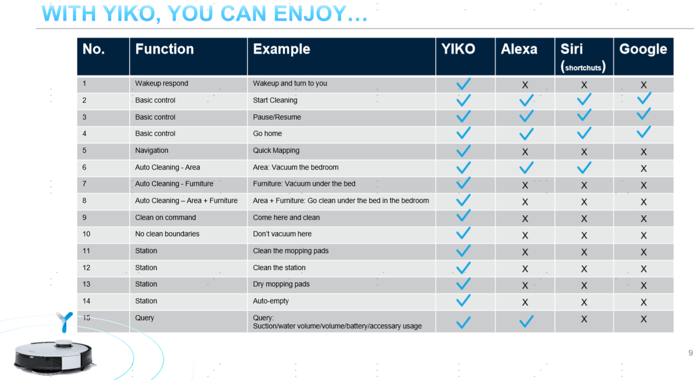 - Der Deebot X1 Omni hat seinen eigenen Sprach-Assistenten spendiert bekommen. Auf Zuruf von „OK Yiko“ besteht die Möglichkeit dem Robosauger dazu zu bewegen spezifische Aufgaben zu erledigen. Allesamt in der Theorie detaillierter als mit Alexa & Co. Im Alltag hat der Robo auch gut auf die Kommandos gehört. Aber ich muss ehrlich gesagt gestehen, dass ich mir das nicht antue und weitere Kommandos merke. Ich setze lieber auf die automatisierte tägliche Reinigung. Dennoch packe ich hier noch eine kleine Vergleichstabelle vom Hersteller rein, damit man die Unterschiede besser erkennt, was welcher Assistent ermöglicht.