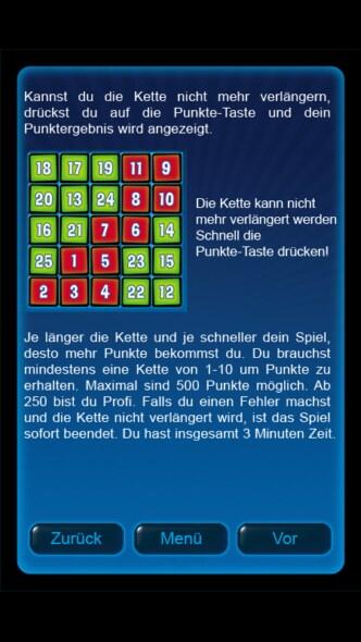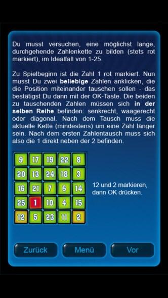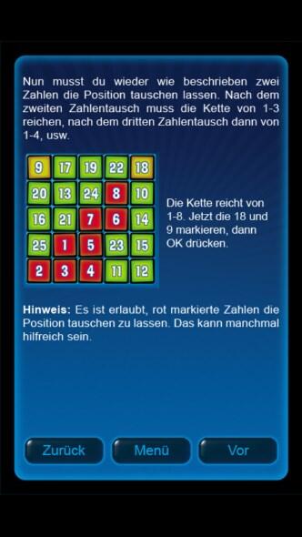 Konkret: Nach dem ersten Zahlentausch muss die 2 direkt neben der 1 liegen. Beide Zahlen sind dann rot markiert (Plättchen umdrehen). Nach dem nächsten Zahlentausch muss die 3 direkt an die 2 angrenzen, usw., im Idealfall bis zur 25. Hier die Spielregel, gerade mal drei Mini-Seiten: