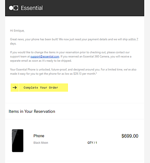Doch es gibt auch gute Nachrichten für die Nutzer, denn das schwarze Modell wird innerhalb der nächsten 7 Tage verschickt. Das weiße Modell kommt später, doch die schwarze Version scheint final zu sein und daher werden gerade die Vorbesteller informiert. Bei GSMArena hat man eine solche Mail von Essential erhalten.