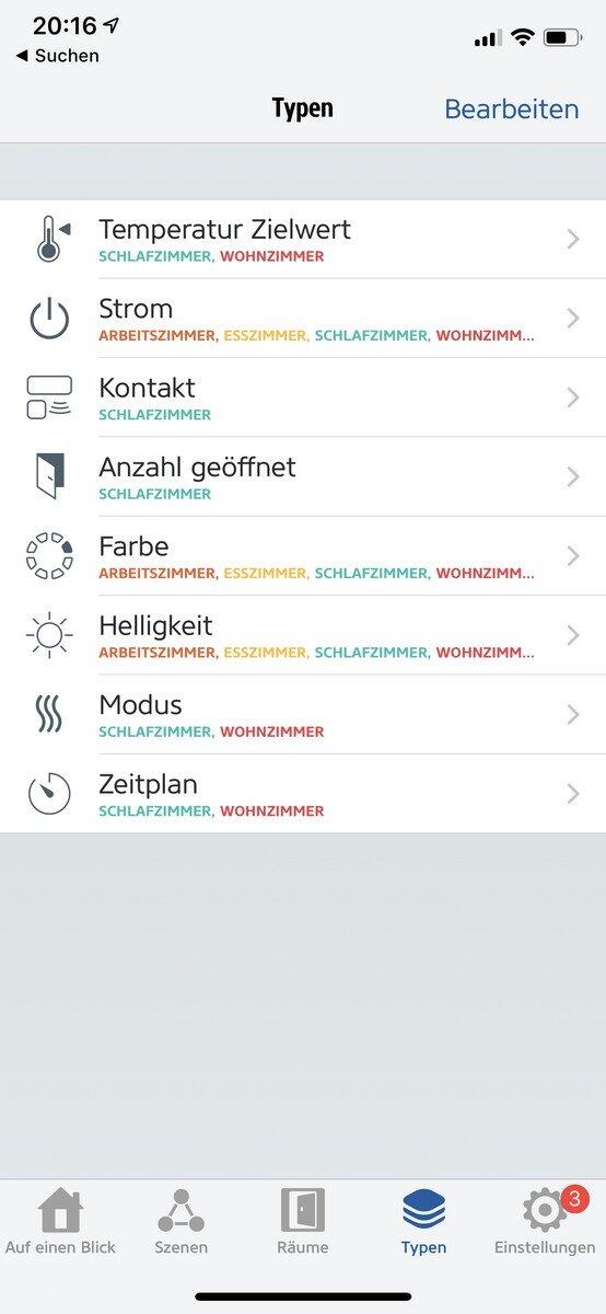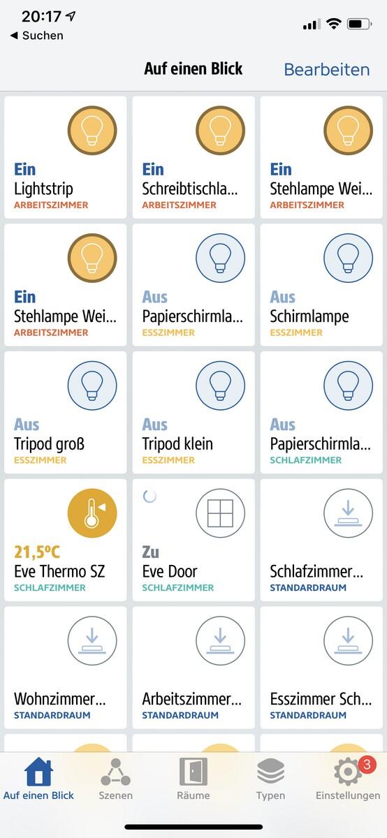 Zugegeben, das sieht sicher nicht überall so aus. Dadurch, dass die Eve App auf Homekit zugreift und dann auch meine Hue-Leuchten angezeigt werden, wird es hier sehr schnell unübersichtlich.