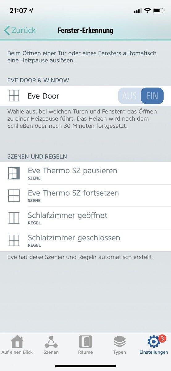 Allerdings führt das Auftauchen aller anderen Homekit-Devices im Netz auch dazu, dass diese zusammen mit den Geräten von Eve in Szenen oder Regeln auftauchen können. Der Eve Heizkörperthermostat und der Fenstersensor können allerdings über die „Einstellungen“ des Thermostats aneinander gekoppelt werden. Ich habe also erstmal die Basiseinstellung genutzt, damit die beiden Geräte miteinander sprechen können.