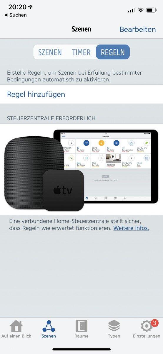 Die Lösung dafür ist das manuelle Überschreiben der automatischen Szene durch selbst erstellte Regeln, doch hier kommt der große Knackpunkt bei Homekit: Für eigene Regeln wird ein Apple Gerät benötigt, das als Hub dienen kann.
