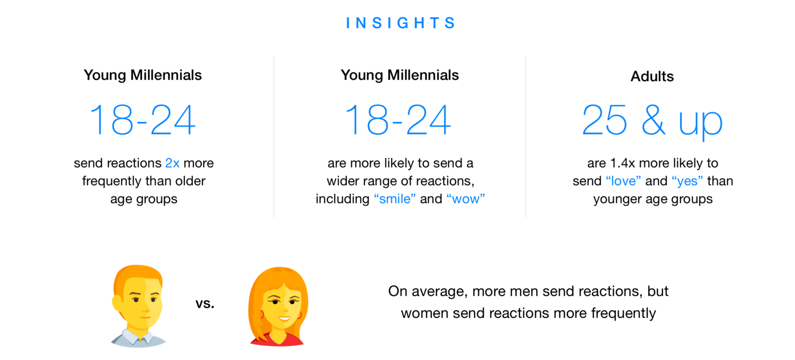 Die Analyse ergibt, dass die Message Reactions wie zu erwarten war vor allem von der jüngeren Zielgruppe verwendet werden. Personen im Alter zwischen 18 und 24 Jahren versenden doppelt so viele Reactions wie die ältere Zielgruppe und zeigen dabei auch eine größere Vielfalt. Betrachtet man alle Altersgruppen, werden die Message Reactions am häufigsten mittwochs und gegen Abend verwendet, Männer nutzen das Feature zudem öfter als Frauen.