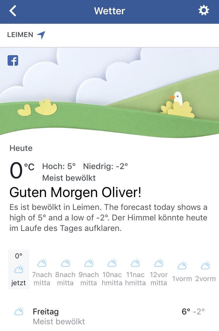 Facebook liefert euch hier eine kurze Prognose für den Tag, eine Übersicht für die nächsten 24 Stunden und eine Prognose für die nächsten 5 Tage. Im Grunde also alles, was man auch bei einer Wetter-App vorfindet. Bei mehr als 5 Tagen ist eine Prognose sowieso quatsch, von daher sollte das komplett ausreichen.