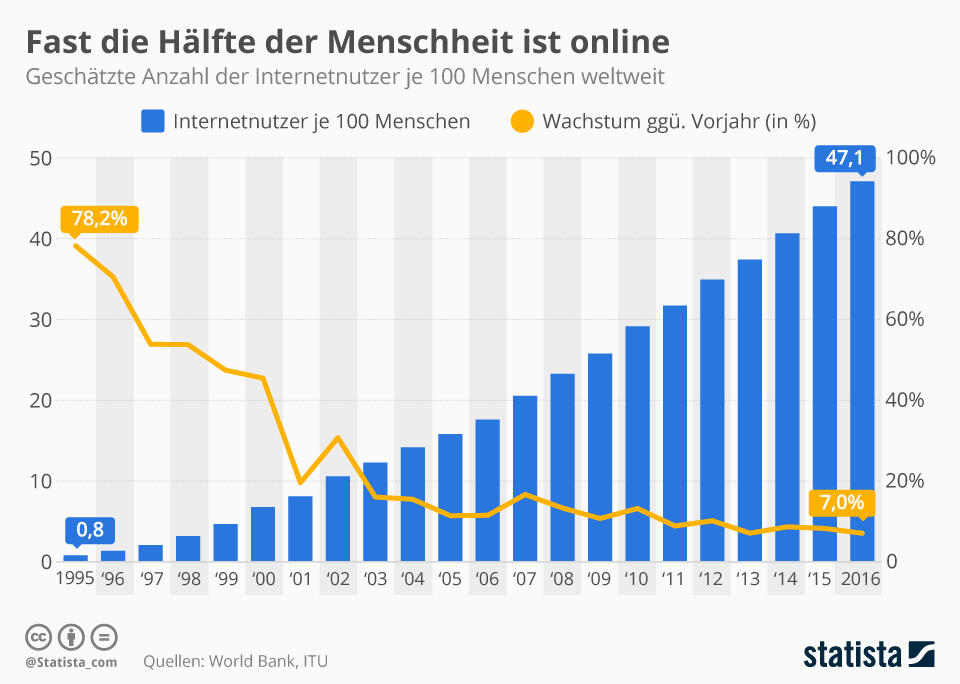 Aktuell nutzt laut Angaben der International Telecommunication Union (ITU) fast die Hälfte der Menschheit das Internet. Aber es zeigt sich auch, die Zeiten des ganz großen Booms sind vorbei. In den letzten Jahren stagniert das jährliche Wachstum nämlich bei unter zehn Prozent. Das G-20 Ziel ist also ziemlich ambitioniert.