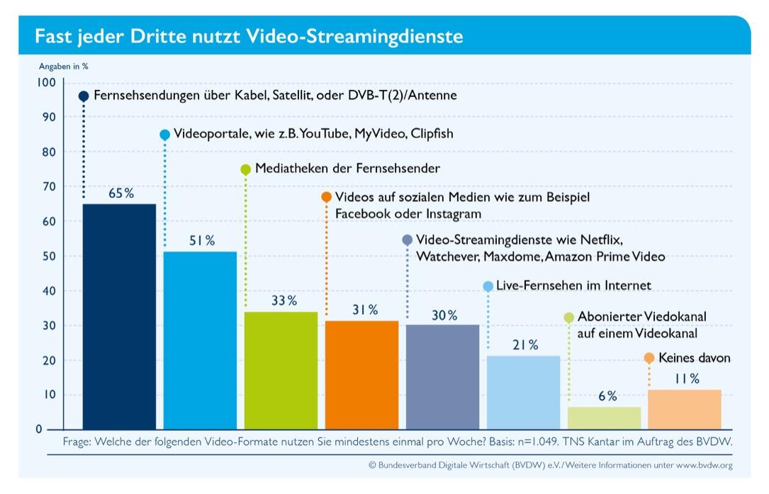 Lineares Fernsehen büßt in Deutschland weiter an Beliebtheit ein. Das ergibt eine repräsentative Umfrage von TNS Kantar im Auftrag des Bundesverband Digitale Wirtschaft (BVDW) e.V.. Während der Anteil der Nutzer in 2016 noch bei 22 Prozent lag, sind es in diesem Jahr immerhin 30 Prozent. Lineares Fernsehen über Kabel, Satellit oder DVB-T ist mit 65 Prozent zwar unverändert auf Platz eins, büßt aber gegenüber dem Vorjahr (71 Prozent) deutlich ein.