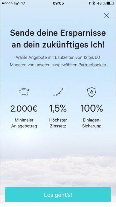 Der Mindestanlagebetrag liegt bei 2000 Euro und die maximal verfügbaren Zinsen bei 1,48 Prozent. N26 verspricht zudem „100% Einlagensicherung“ für die Anlage. Dabei sollte allerdings beachtet werden, dass die Einlagensicherung des jeweiligen Landes der Anlagebank greift und nicht die deutsche Einlagensicherung von N26.