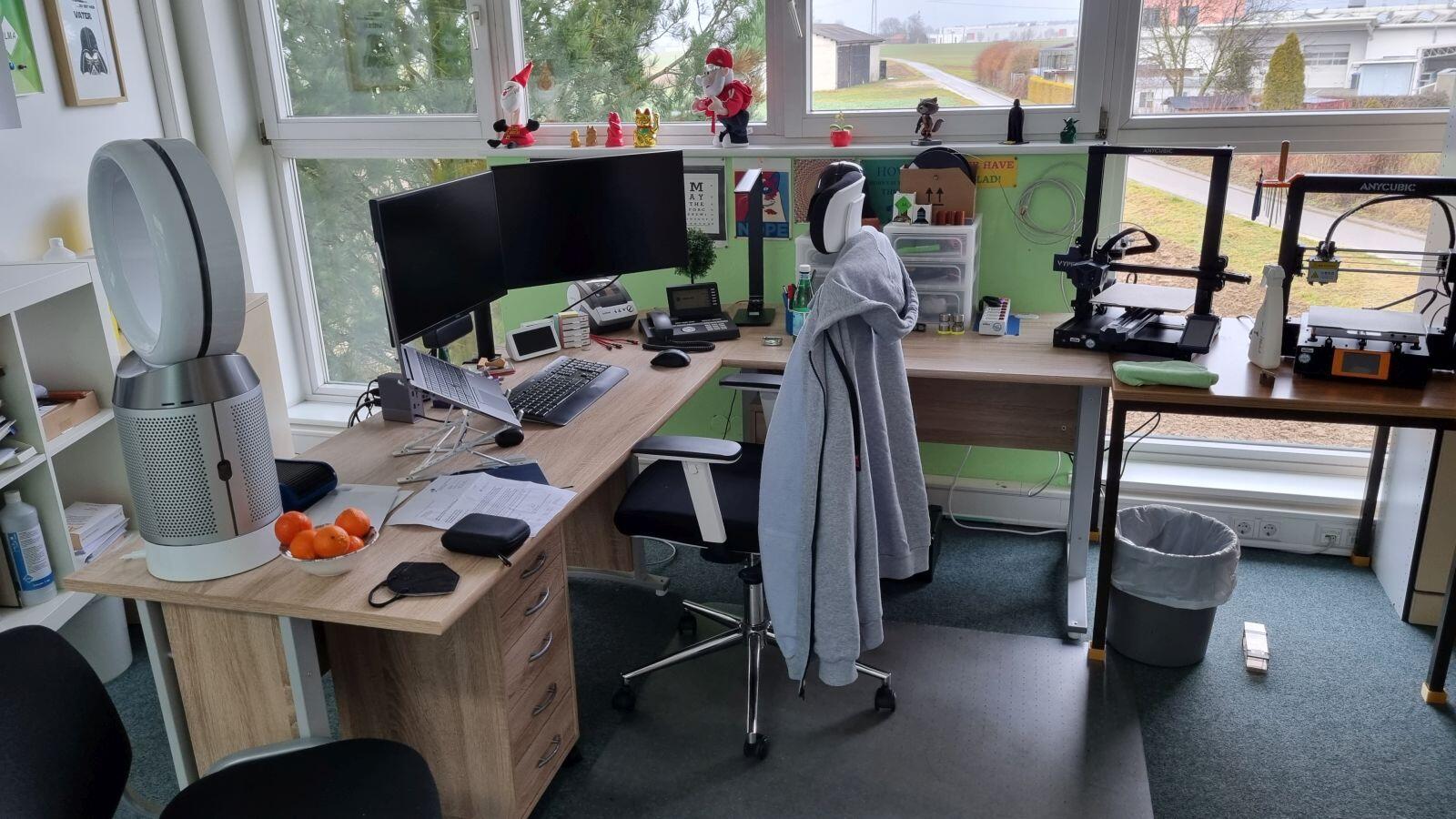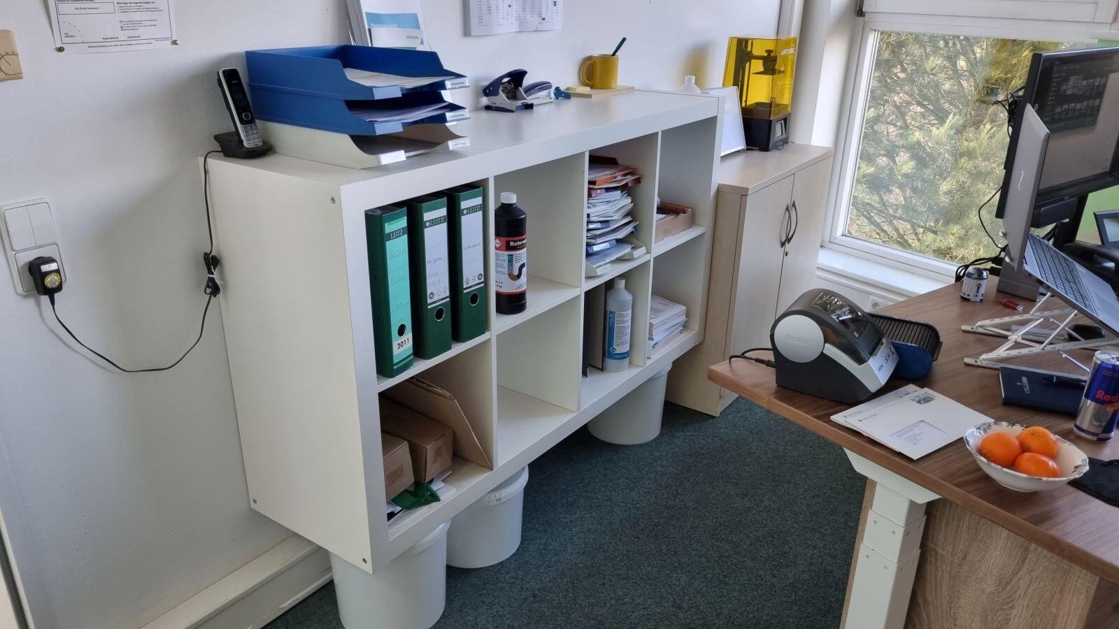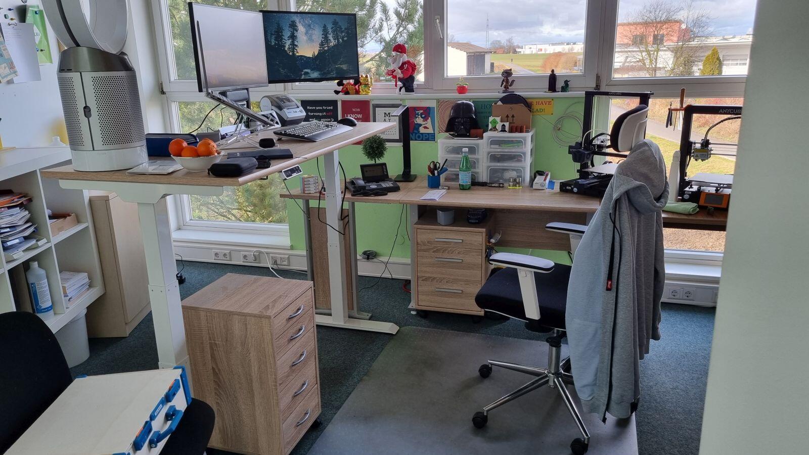Der Plan war aber, dass ich den kleinen Tisch ganz rechts, auf dem die 3D-Drucker stehen, entsorge und meinen bisherigen Eckschreibtisch ohne die abgerundete Ecke quasi zu einer Theke an der Wand entlang stelle. Das ging auch problemlos mit bisschen Akkuschrauber-Power und dann konnte der komplette E7 inkl. der wenige Tage später eintreffenden Arbeitsplatte endlich genutzt werden.
