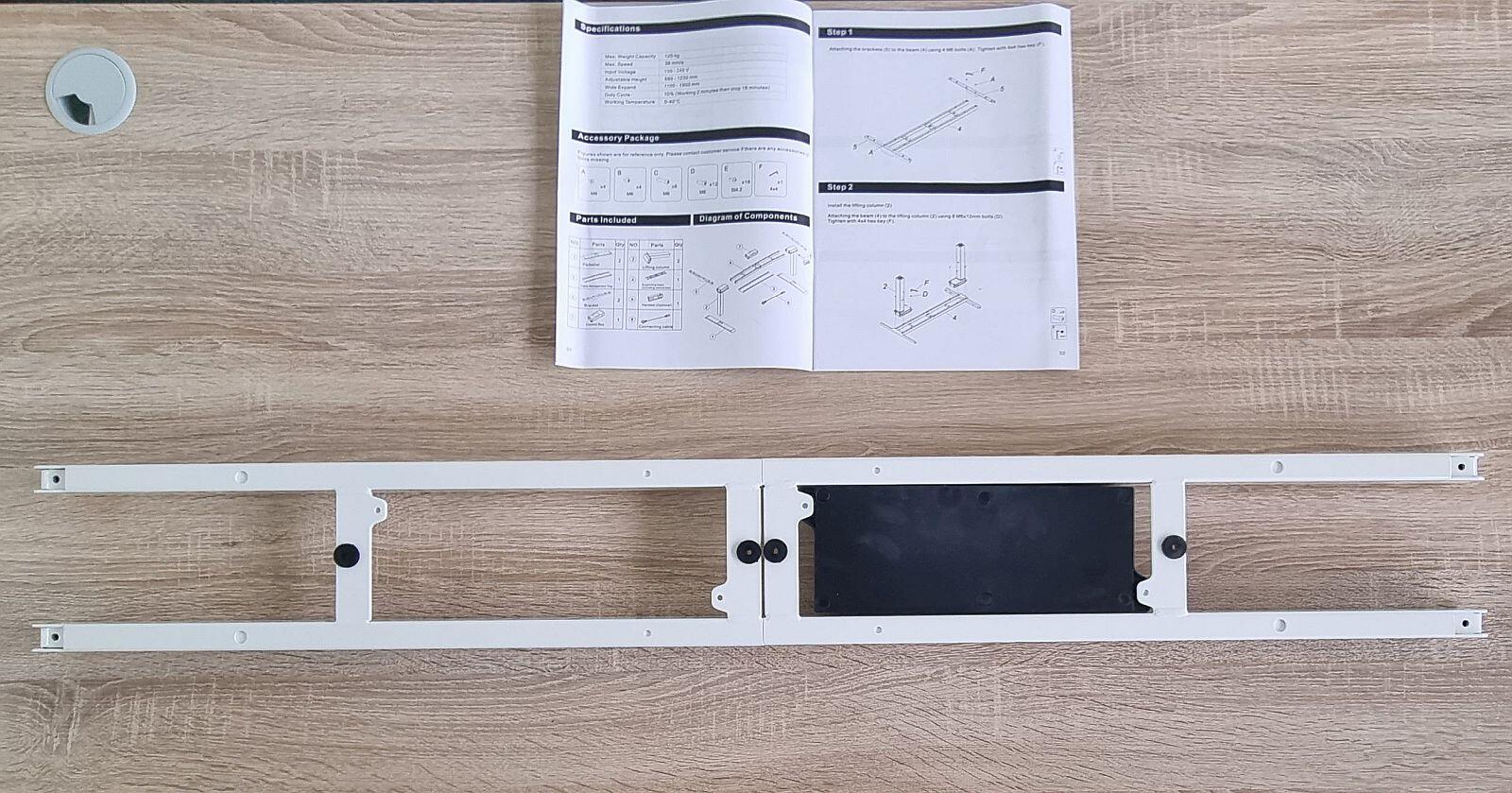 Der Aufbau gestaltet sich super einfach. In der beiliegenden Anleitung ist alles gut beschrieben und bebildert und auch ohne Lupe prima lesbar. In wenigen Minuten war alles montiert. Beide Füße links und rechts an den Querträger und das Gestell dann auf die Tischplatte geschraubt. Kabel verlegen und das war es auch schon fast.