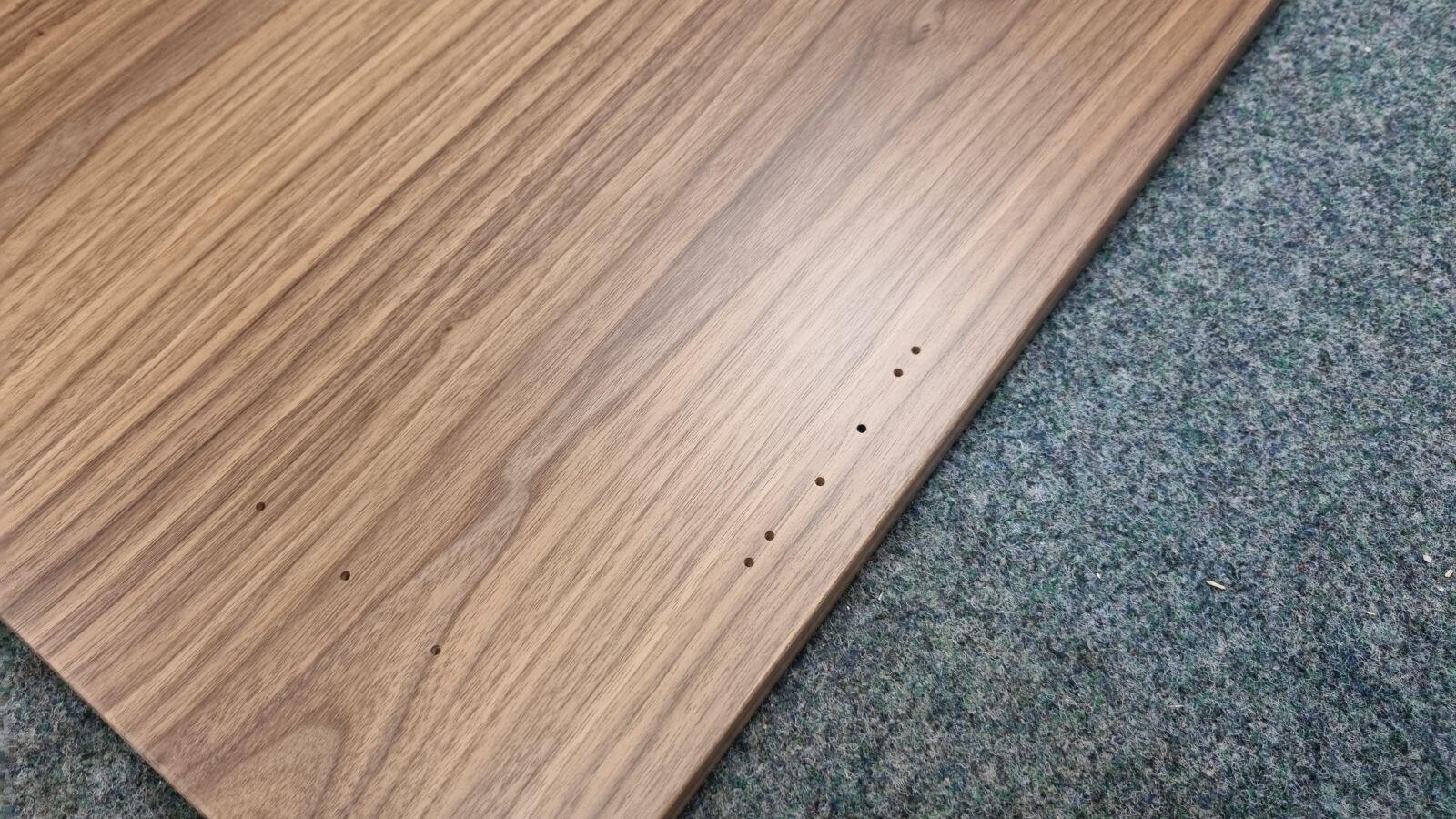 Die Schreibtischplatte hat Vorbohrungen für die Füße und auch rechts und links schon Vorbohrungen für die Montage des Bedienteils. Je nachdem, auf welcher Seite man das Touchpad später haben möchte.