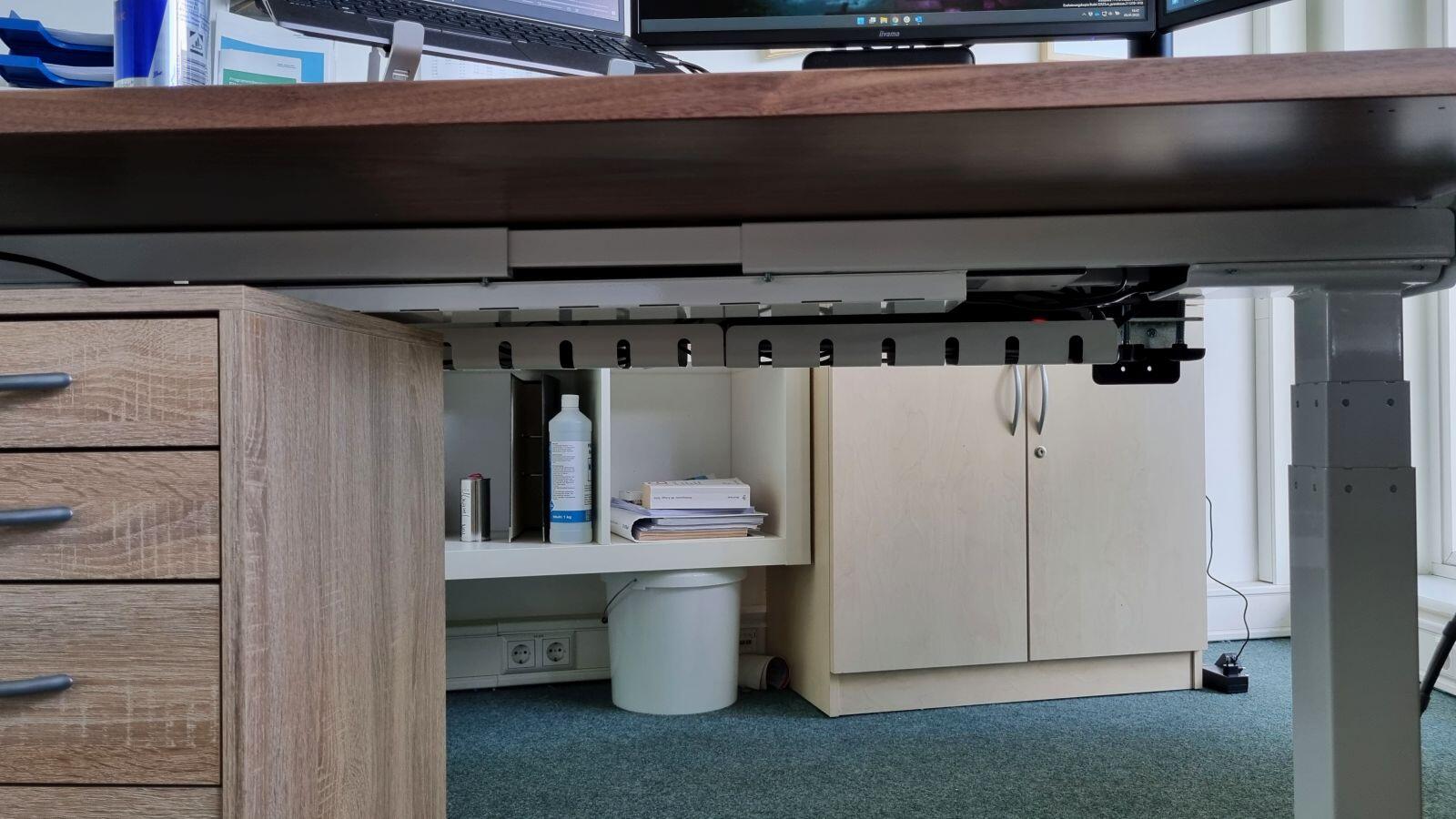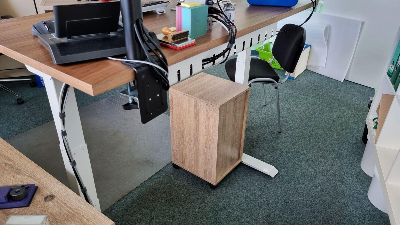 2. Das mit dem normalen Rechner auf dem Boden ist klar der worst Case für einen solchen Schreibtisch. Aber – es gibt da solche Vorrichtungen, wo du diesen Rechner von unten an die Platte hängen kannst. Dann fährt der praktisch mit hoch und runter. Hattest du das auf dem Schirm? Sicher auch nicht ideal, aber evtl. ein guter Weg zwischen beiden Welten?