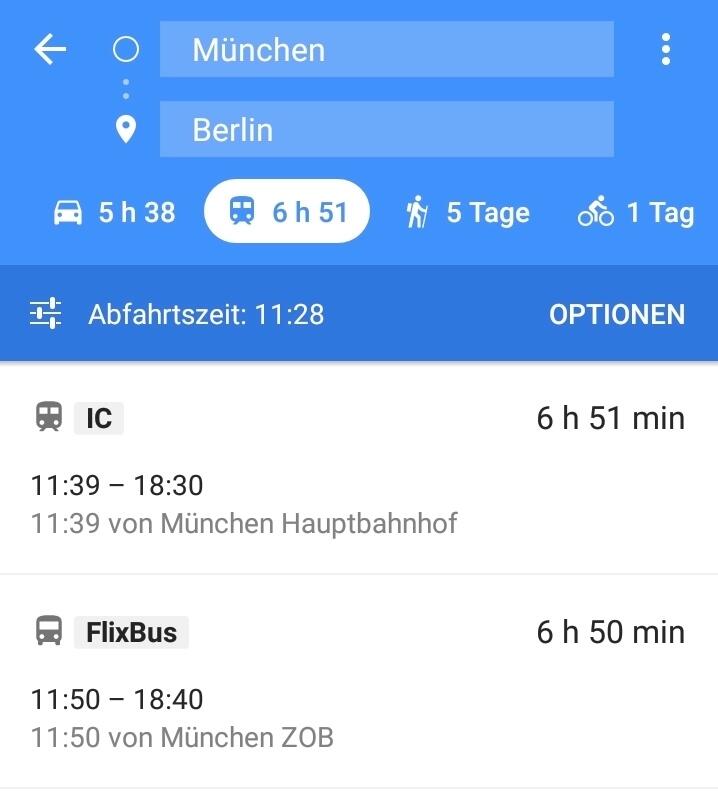 Reisende wählen in Google Maps ihren Startpunkt, ihr Ziel und das Verkehrsmittel. Wählt man in den Optionen den „Bus“ aus, werden ab sofort auch FlixBus-Verbindungen angezeigt.
