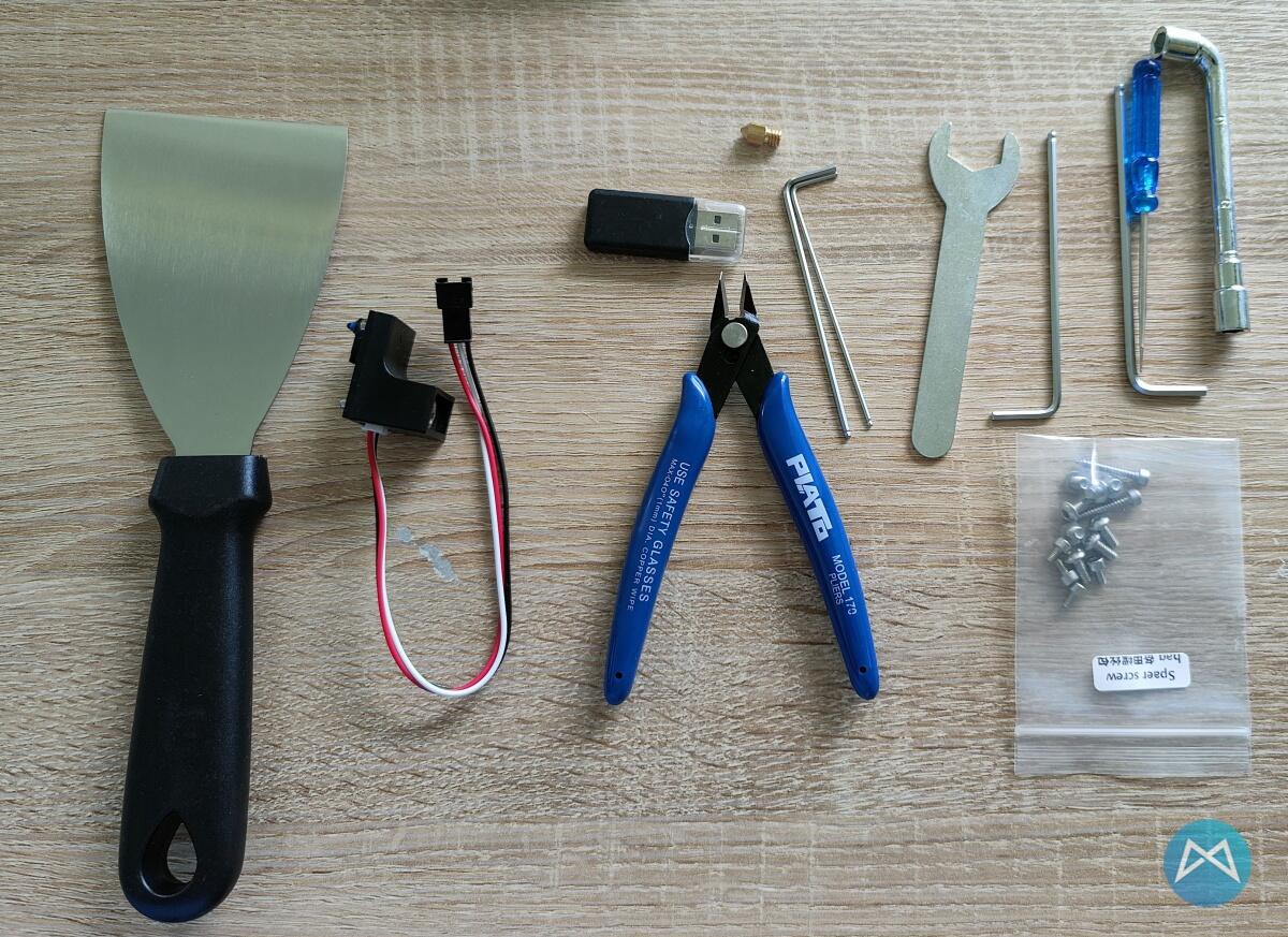 Übrig bleibt das übliche Werkzeug in Form der Spachtel zum Lösen der fertigen Druckobjekte und ein paar Schrauben und die Zange nebst Kartenleser.