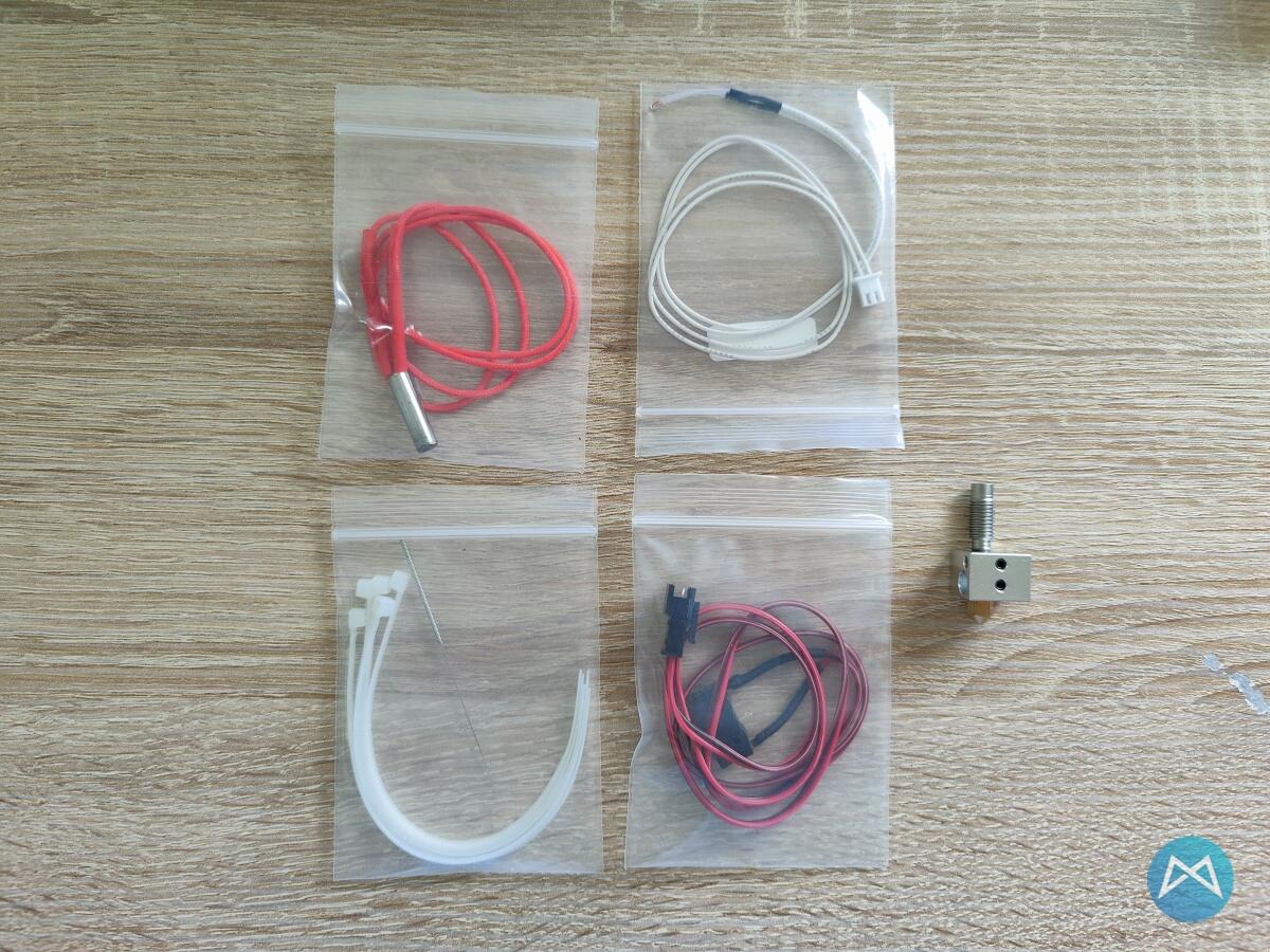 Auch beim FLSUN-Drucker war wie beim Anycubic Mega-S noch eine extra Giveaway-Tüte im Lieferumfang enthalten. Dort drin befand sich ein kompletter Druckkopf inkl. Hotend usw. Dazu noch ein Temperatur-Fühler und das Heizelement plus ein Endstop, einer Nadel zur Reinigung des Druckkopfs und ein paar Kabelbinder.