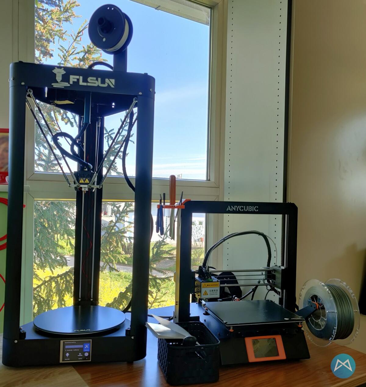 Verglichen mit dem Anycubic Mega-S ist der Flsun Delta-Drucker natürlich deutlich in der Bauform höher. Inkl. der unten sichtbaren kleinen Filamentrolle ist der Drucker fast 1 Meter hoch! Allerdings kann er auch mal eben 255 * 360 mm drucken und benötigt weniger Grundfläche auf dem Schreibtisch, als der Anycubic.