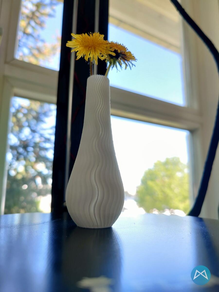 Ich musste mir dann auch noch ein weiteres Testobjekt aus der beliegenden SD-Karte anschauen. Dort gibt es noch eine kleine ca. 13 cm hohe Vase. Testweise habe ich sie schneller gedruckt als ich sonst je auf einem Drucker drucken würde. Also fix 90 mm/s und 0.3 Layer eingestellt und noch ein wenig von dem beiliegenden weißen Filament verbraten. Das Ergebnis kann sich wirklich sehen lassen und hat insgesamt nicht einmal 2 Stunden gedruckt!