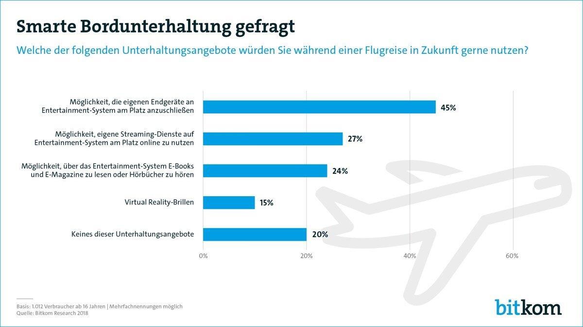 In Zeiten der Digitalisierung wächst bei den Passagieren der Wunsch nach smarten und individuellen Unterhaltungsangeboten. Das hat eine repräsentative Befragung im Auftrag des Digitalverbands Bitkom ergeben. Demnach möchten 45 Prozent die Möglichkeit haben, eigene Endgeräte wie Smartphone oder Tablet an das Entertainment System am Platz anzuschließen. So könnten Passagiere beispielsweise auf dem eigenen Gerät gespeicherte Filme ansehen.