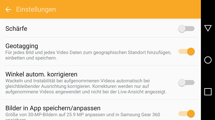 Ansonsten erfüllt die Anwendung aber zumindest bei meinem G4 den Großteil der Funktionen einwandfrei und erlaubt auch das manuelle Anpassen bspw. des ISO-Wertes. Auffällig ist neben seltener Aussetzer eine miese Auflösung der Bedienknöpfe innerhalb der Liveübertragung, dennoch bietet der Gear 360 Manager auch auf Samsung-fremden Geräten einen klaren Mehrwert.