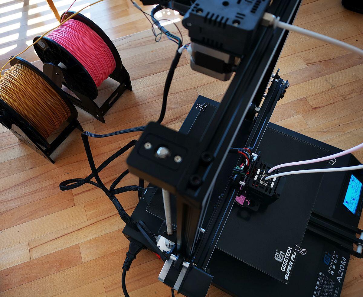 Dieser Tage traf endlich der vor langem angekündigte neue Geeetech A20M 3D-Drucker ein. Die Besonderheit bei diesem Drucker ist unter anderem die, dass er Drucke in Dual-Color beherrscht. Dabei führen zwei Extruder das Filament in das Hotend rein und eine Nozzle druckt dann mit der erzielten Mischung aus.
