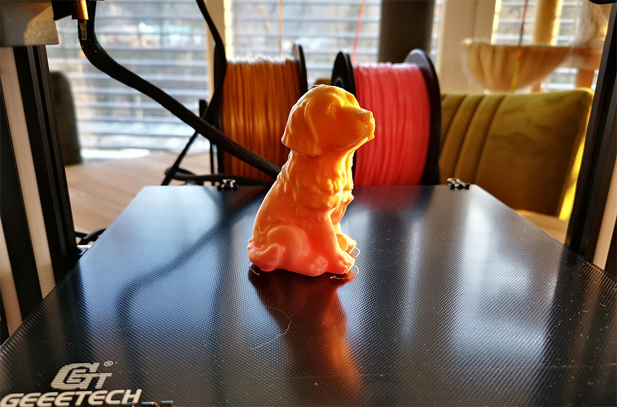 Natürlich habe ich mich direkt hinreißen lassen und direkt nach dem Zusammenbau noch einen auf der beiliegenden SD-Karte befindlichen Hund in DualColor (Verlauf von 0 % zu 100 % – also von einer Farbe zur anderen) drucken lassen. Das klappte problemlos. Allerdings ist das bei den beiliegenden Elementen fast immer der Fall. :)