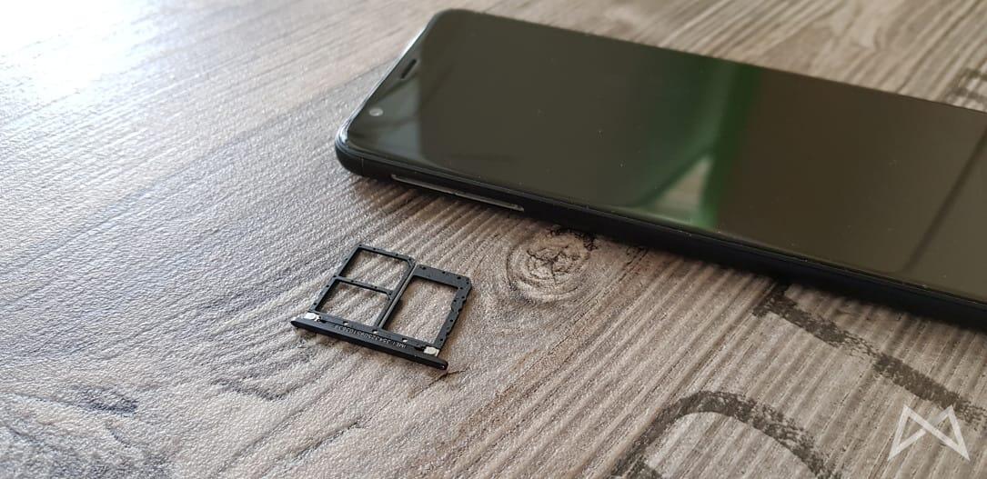 Auf der linken Seite finden wir den Slot für die SIM und die MicroSD-Speicherkarte. Besonderheit ist hierbei die Breite des Slots, weil die Karten nicht hintereinander sondern zwei SIM nebeneinander und die Speicherkarte darunter Platz findet. Wir haben hier also ein Dual-SIM-Gerät, welches mit zwei SIM-Karten und einer Speicherkarte betrieben werden kann.