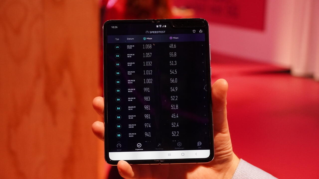 5G Speedtests auf dem Samsung Galaxy Fold. Der einzige Vorteil von 5G NSA besteht in schnellen Downlink-Geschwindigkeiten.
