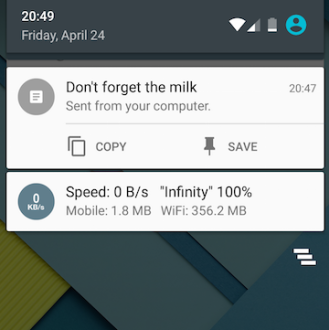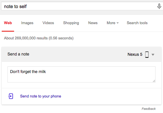 Um diese Funktionen zu erreichen, muss man lediglich entsprechende Suchanfragen in die Google-Suchmaske eingeben. Sucht man also beispielsweise nach „note to self“ oder „send a note“, wird eine Google-Karte mit einem Textfeld geladen. Hier kann man seinen Text eingeben sowie das Android-Gerät auswählen, an das die Notiz geschickt werden soll. Dort wiederum bekommt man eine Benachrichtigung über diese Notiz. Hier kann man den Text entweder kopieren oder in Gmail und Keep abspeichern. Die Trigger-Suchbefehle können aber auch direkt mit dem Inhalt der Notiz ausgestattet werden, ein Beispiel wäre hier also „note to self to buy bread“.