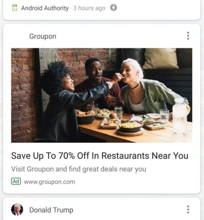 Gestern tauchten die ersten Meldungen von Nutzern auf, die Werbeanzeigen in ihrem Feed auf dem Android-Smartphone entdeckten. Die Zahl der Nutzer ist gering, doch Android Police hat dazu mal ein bisschen recherchiert. Man hat unter anderem von einem Leser einen Screenshot erhalten, so sieht das dann aus: