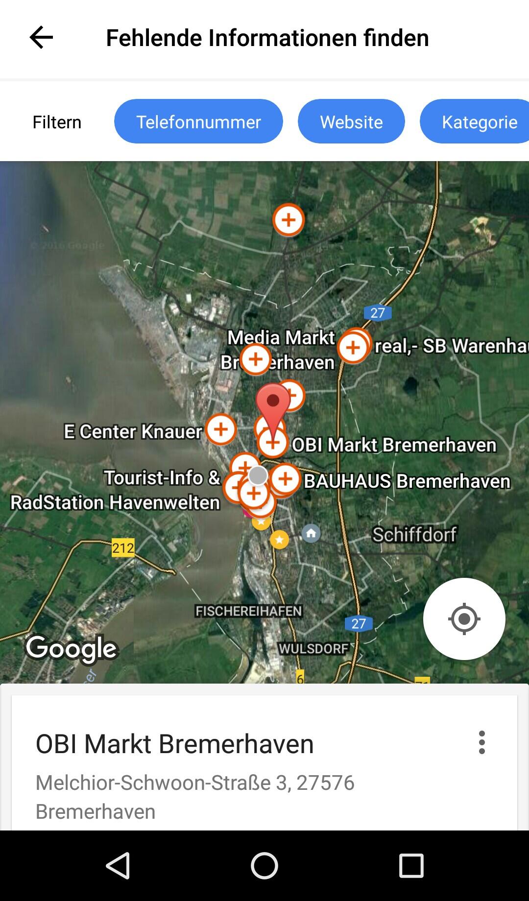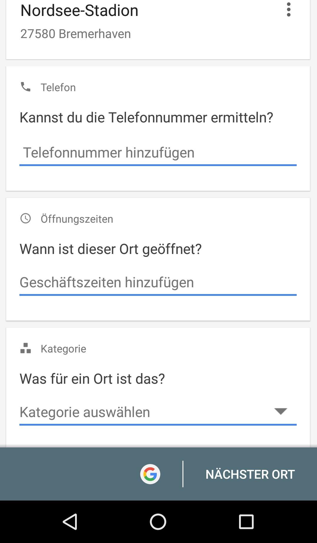 Wählt ihr einen gefilterten Ort aus, wird prominent der entsprechende Suchbegriff angezeigt, darunter aber auch die weiteren Informationen, die diesem Eintrag noch fehlen. Gerade die Angabe der Kategorie eines Ortes ist dabei jedoch nicht so umfangreich, wie ich es mir gewünscht hätte und als Local Guide, der eigentlich viel mit dem Mapmaker arbeitet, unterwegs benötige. Zum Beispiel fehlt die, für die richtige Eingrenzung von Suchen immens wichtige Möglichkeit, mehrere Kategorien anzugeben, oder die umgangssprachliche Bezeichnung, beziehungsweise die Sprache des Namens anzugeben.
