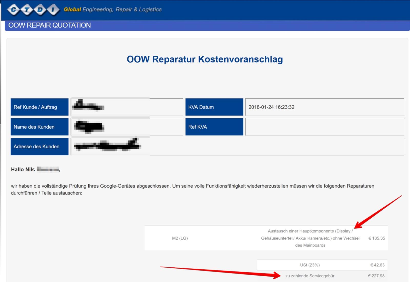 Leider waren vom Google-Reparaturpartner „CTDI“ keine weiteren Infos zu erhalten. Auch der Google-Support half nicht weiter, wie es denn zu diesem Preis kommen soll. Irgendwie vermutete man einfach einen Fehler. So schreibt Nils: