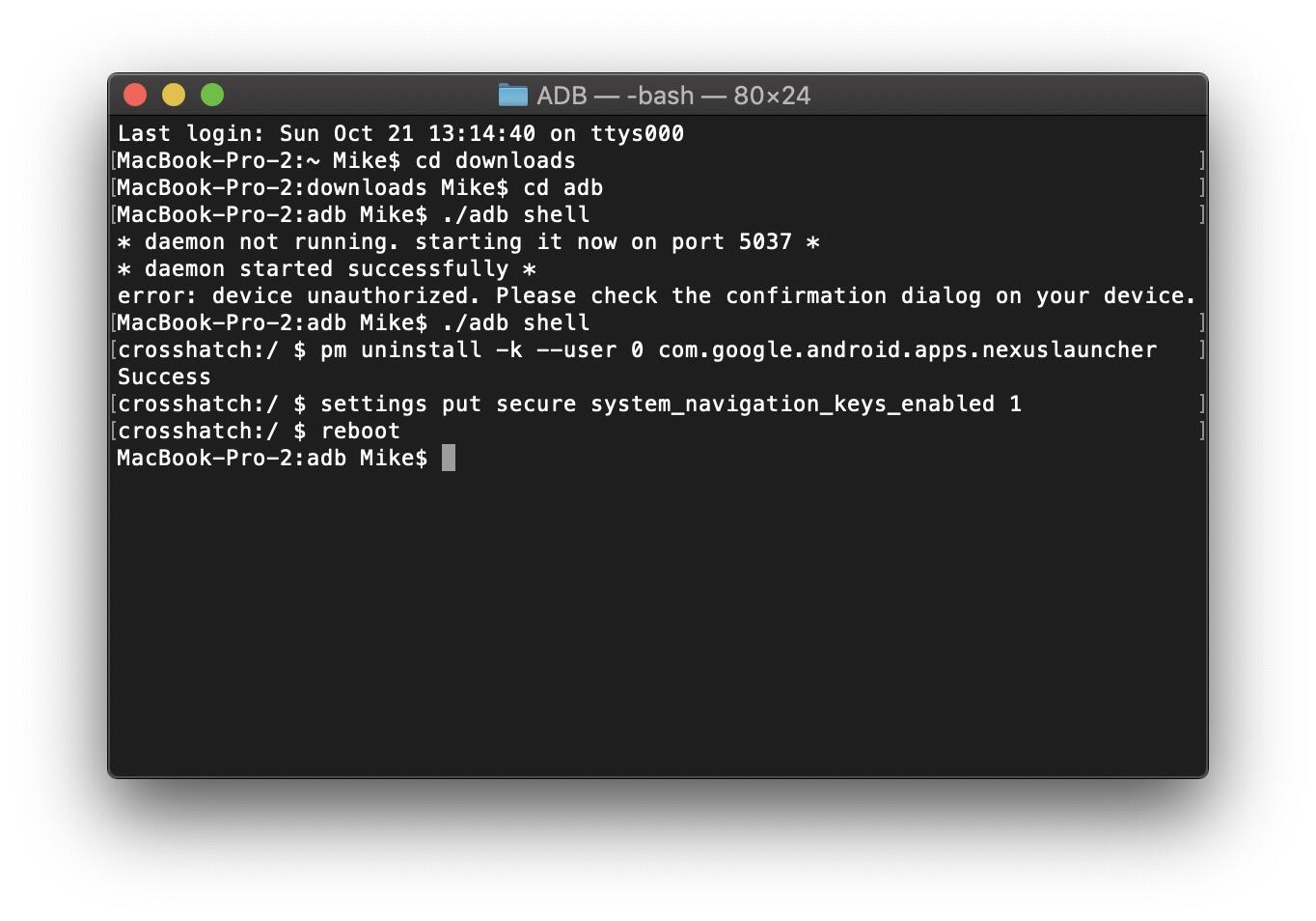 - pm uninstall -k –user 0 com.google.android.apps.nexuslauncher