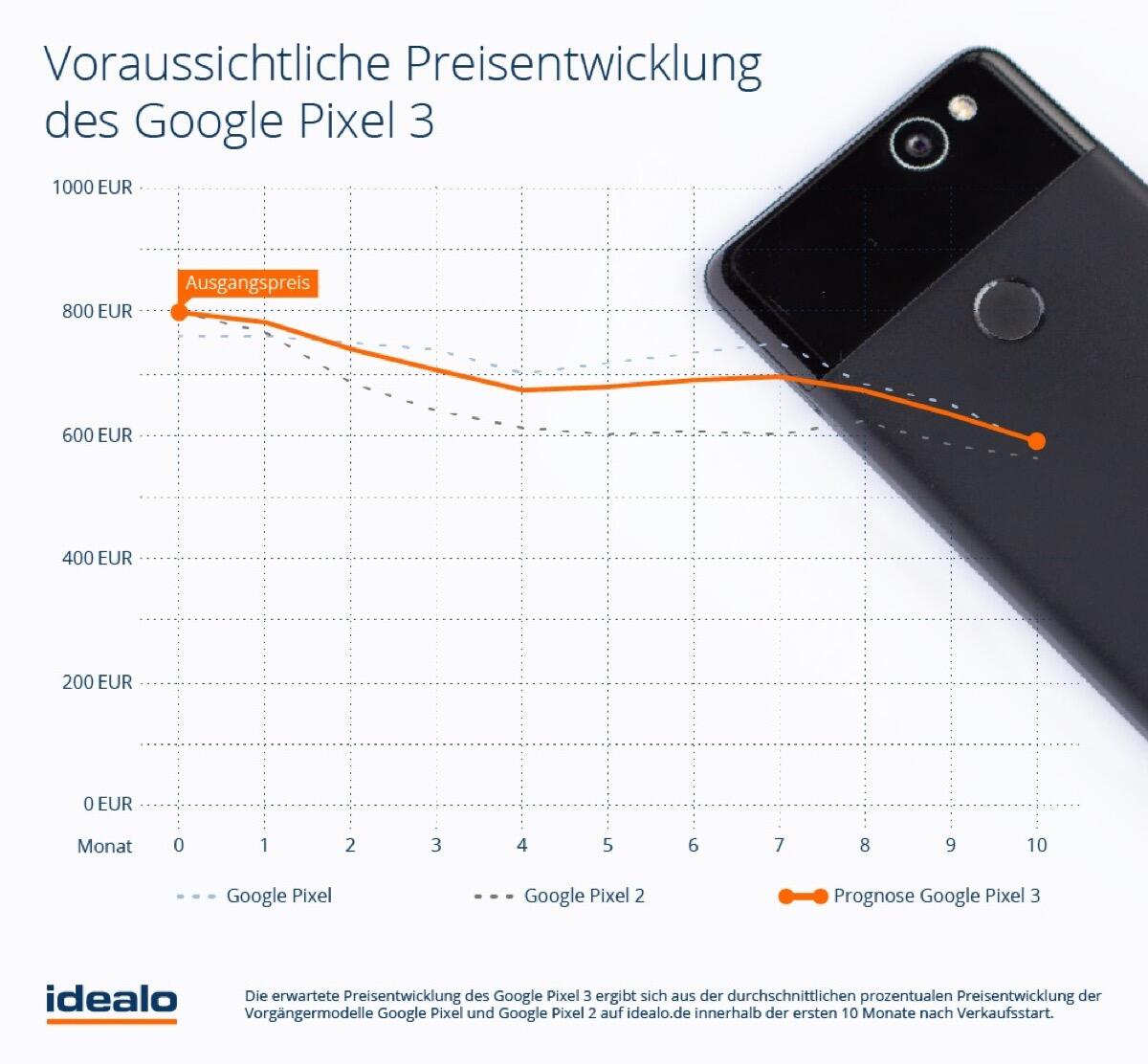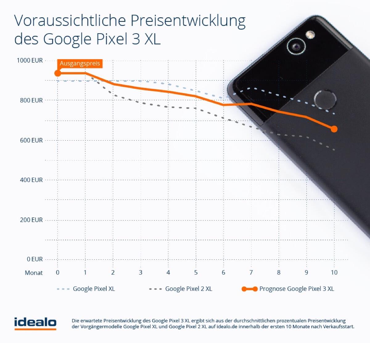 Eine ähnliche Entwicklung ist für das größere Google Pixel 3 XL zu erwarten. Dieses ist laut Prognose nach vier Monaten schon fast 100 Euro günstiger, nach einem halben Jahr lassen sich über 20 Prozent sparen.