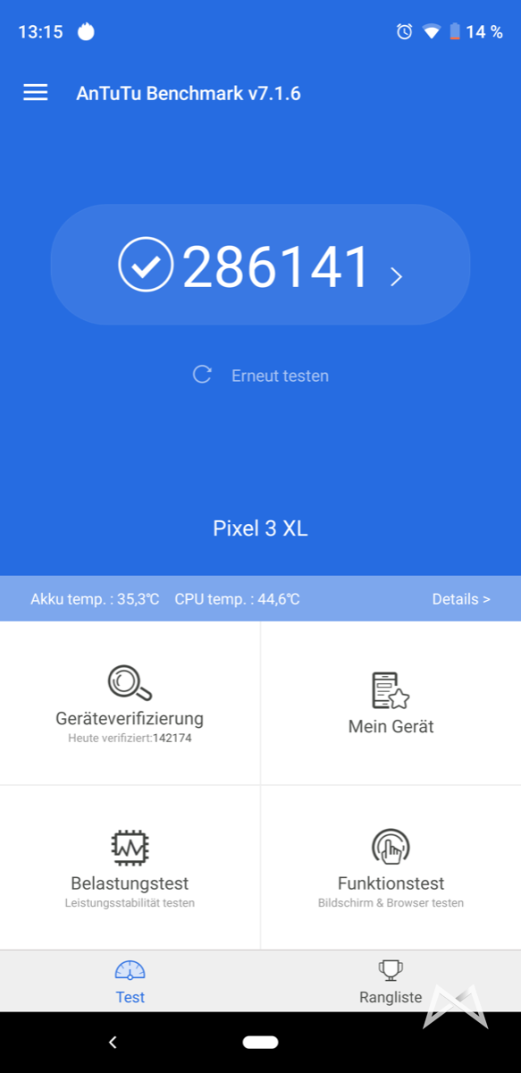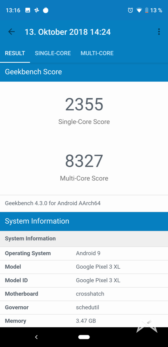 In Sachen Power und Prozessor müssen sich beide Pixel 3 Modelle vor niemandem verstecken. Ich hatte ein wenig Probleme damit AnTuTu zu installieren, aber via Sideload ging es dann am Ende doch. AnTuTu spuckt einen Wert von knapp 286.000 Punkten aus und Geekbench Single 2355 und Multicore 8327.