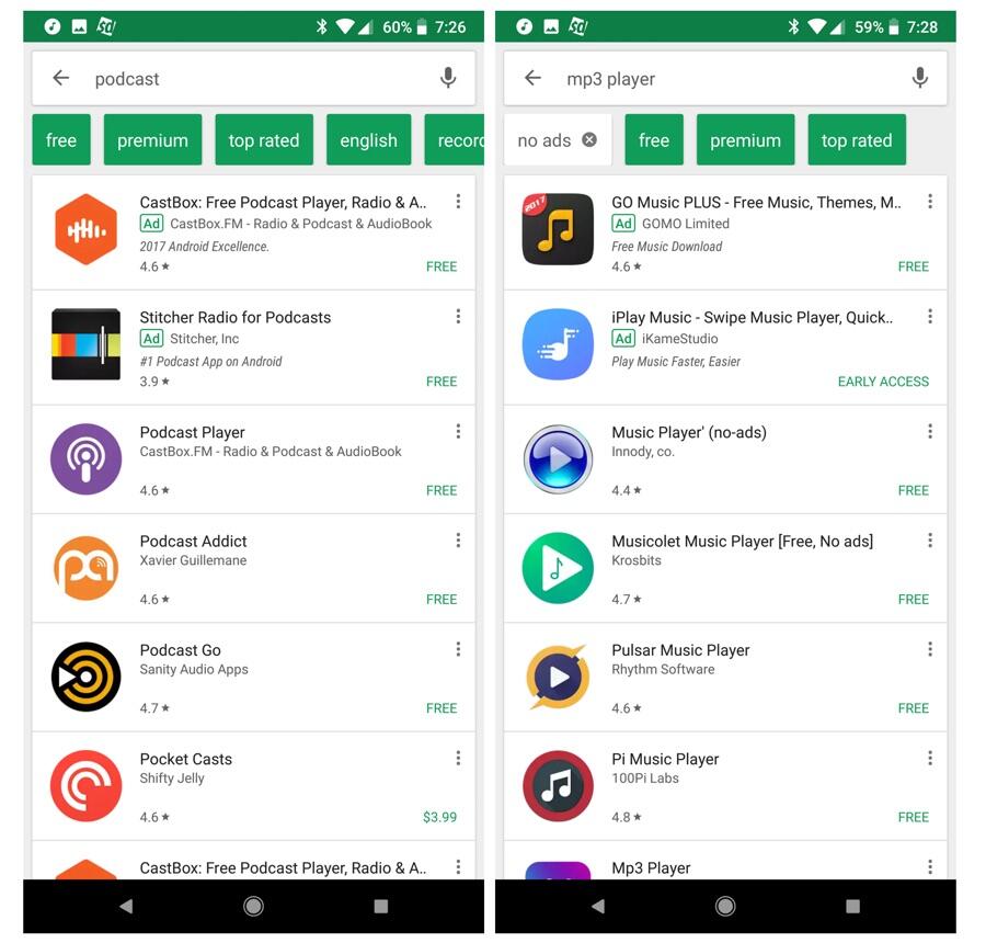 Ein Leser von Android Police hat im Google Play Store eine neue Option für die Suche entdeckt. Bei der Suche nach „Podcast“ oder „Downcast“ wurden ihm Dinge wie „Free“ und „Premium“ oberhalb der Suchergebnisse angezeigt. Auch der Filter für keine Werbung ist zu sehen. Es ist aktuell aber vollkommen unklar bei welchen Wörtern das passiert und bei welchen Nutzern das bereits angezeigt wird.