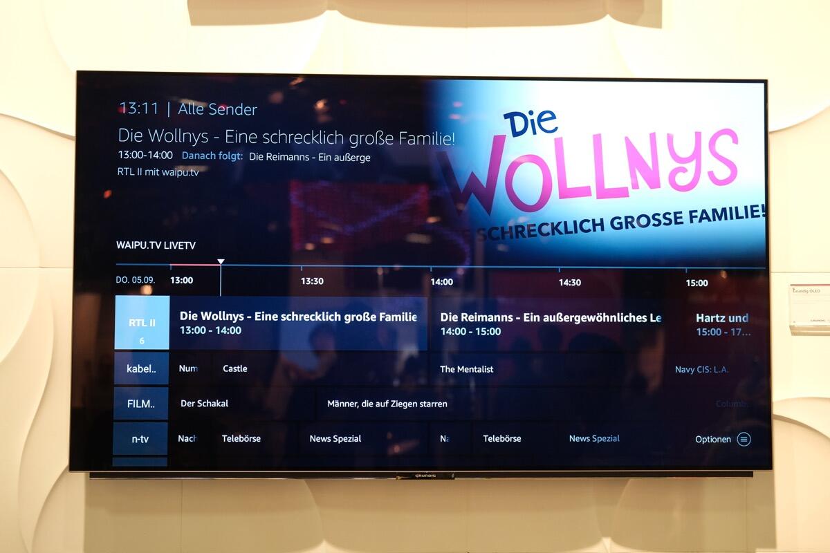 Der Pragrammguide des Grundig OLED Fire TV Edition – hier mit waipu.tv als Fernsehprovider, denn Antennenempfang gibt es in der Messehalle nicht