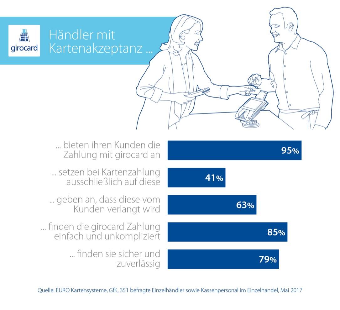 • Rund 95 Prozent der Händler mit Kartenakzeptanz bieten ihren Kunden laut der Umfrage die Zahlung mit girocard an. 41 Prozent setzen ausschließlich auf diese.